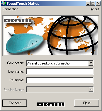 You now enter your ADSL user name and password, and click Connect. TroubleshootingHave you got a green icon like this If you haven't, there is some problem with the Speedtouch driver or modem. If you have a red icon, the driver is functioning, but the modem not plugged in. If you have no icon at all, or the red icon remains after plugging the modem in, there is a driver problem. You need to uninstall it, by following the instructions below, and then start these instructions afresh. If you have, then the modem is working fine. Both the USB and ADSL lights should be lit on the modem. If the ADSL light is not lit, check the modem is plugged in correctly. This may also indicate a problem at your phone exchange.