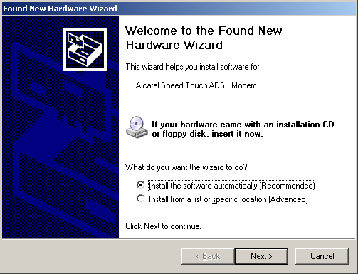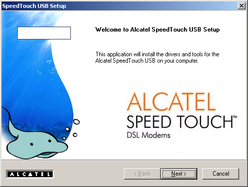 ADSL USB INSTRUCTIONS These instructions are for an Alcatel Speedtouch USB ADSL Modem, though other USB ADSL Modems will work similarly. If using Windows 2000 or XP, you need to have administrator privileges on the computer. NOTE: DO NOT CONNECT THE MODEM TO THE COMPUTER AT FIRST! If you do this, you may end up with an incorrectly installed driver. Installing the Speedtouch SoftwareInsert the CD that came with the modem. It will auto-play and give you a screen like this: