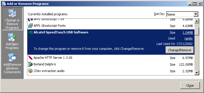 Uninstalling the Speedtouch DriverFirst, unplug the modem from the computer. Go to 'Control Panel' and then to 'Add or Remove Programs'. Scroll down the list to select the appropriate program: